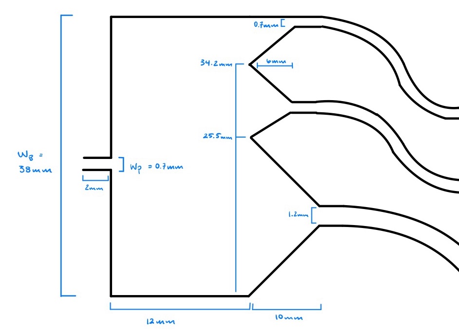 This equation from their work predicts the lateral position of each size band in the broadened region. Using a pinch width of 0.7 mm and broad section of 38 mm, the predicted band centers are 25.5 mm (large) and 34.2 mm (small) from the pinch wall, yielding outlet windows of 25.0, 7.7, and 3.3 mm. Each window narrows through a gentle taper to its neck (10 mm for the 1.2 mm buffer, 6mm for the two 0.7 mm particle lanes), followed by 2–3 mm of straight channel. Although the pre-neck widths differ, the particle outlets are length-matched downstream to equalize hydraulic resistance and maintain stable separation.